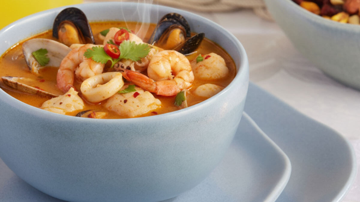 Preparación: Sofríe cebolla, ajo y pimentón en aceite. Agrega los mariscos y cocina unos minutos. Vierte la leche de coco, incorpora hierbas y deja hervir a fuego bajo hasta que espese y los mariscos estén en su punto. Está listo de 20 a 30 minutos.