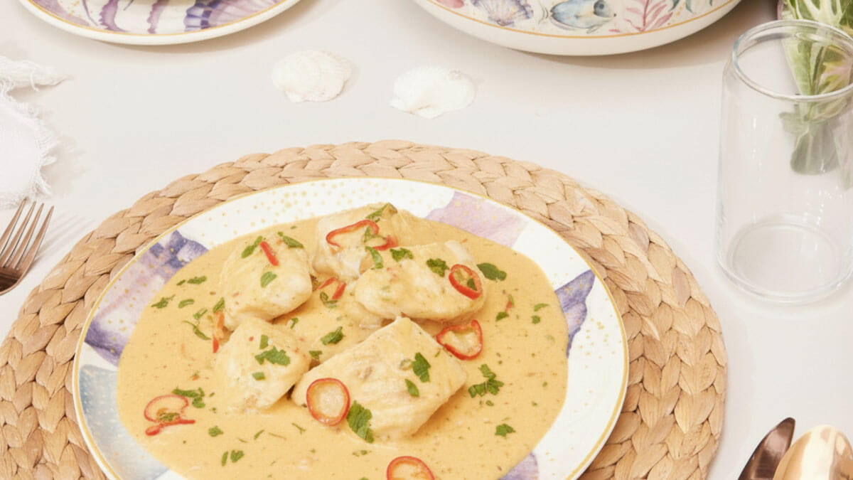 Preparación: Sofríe cebolla, pimentón y tomate. Agrega la leche de coco y cocina hasta que espese un poco. Incorpora el pescado o mariscos con las hierbas y deja al fuego hasta que se cocinen. Está listo en 30 a 40 minutos.
