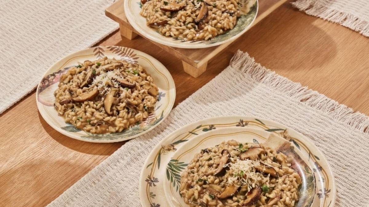 Un plato cremoso y lleno de sabor. Prepara un risotto tradicional con arroz arborio, vino blanco y caldo de verduras, y añade shiitake salteado. Sirve en platos hondos de Vajillas Corona para destacar su presentación.