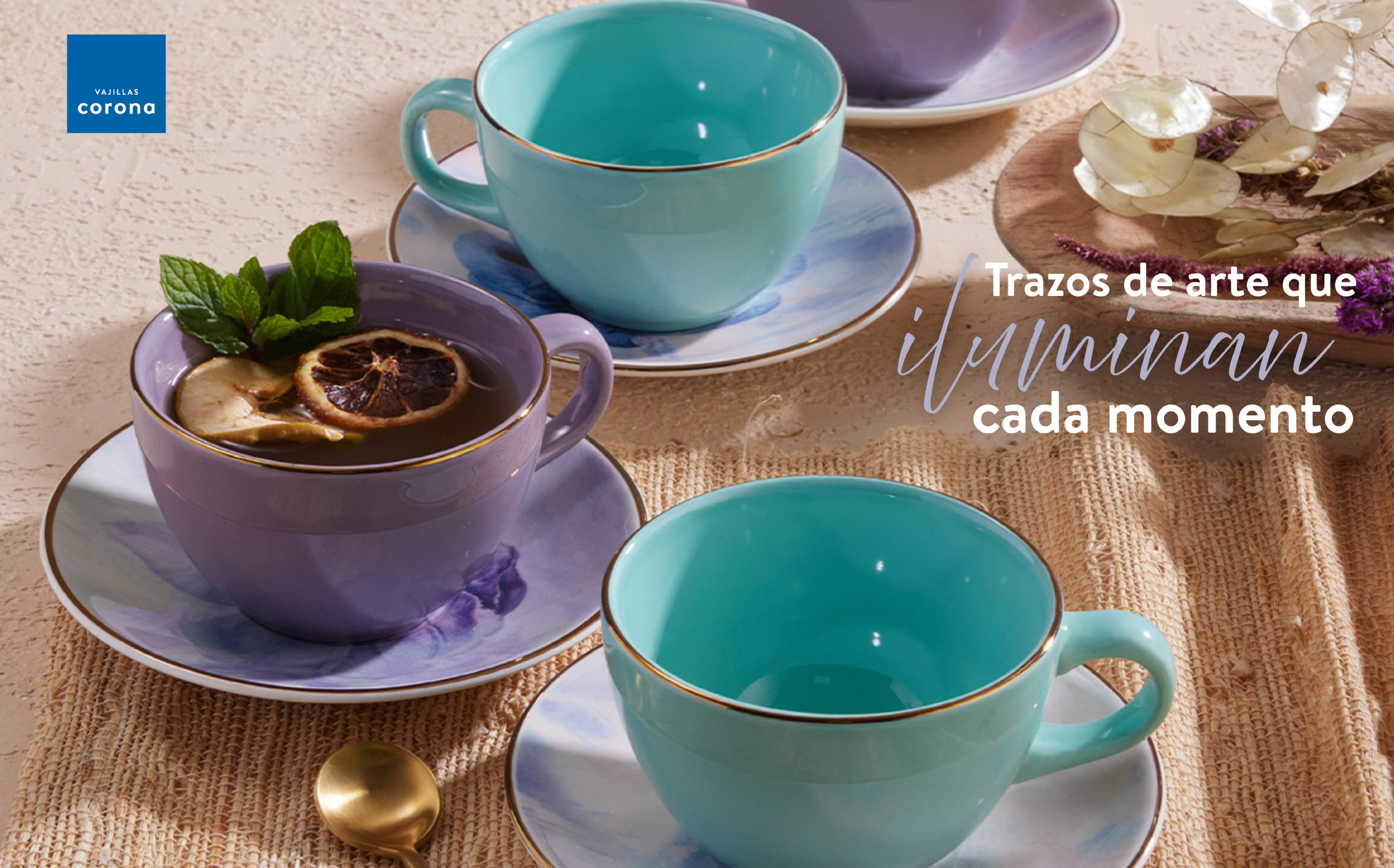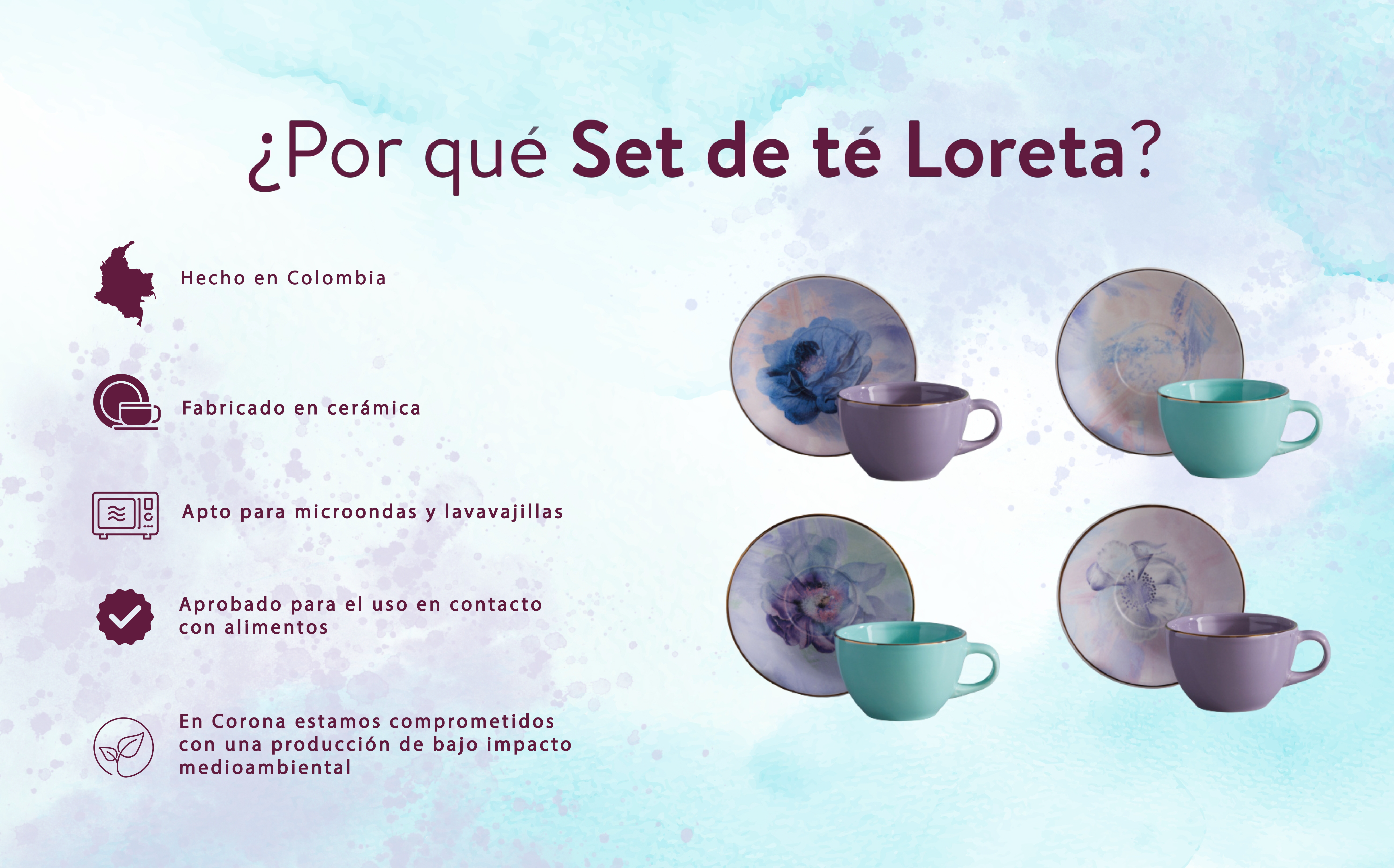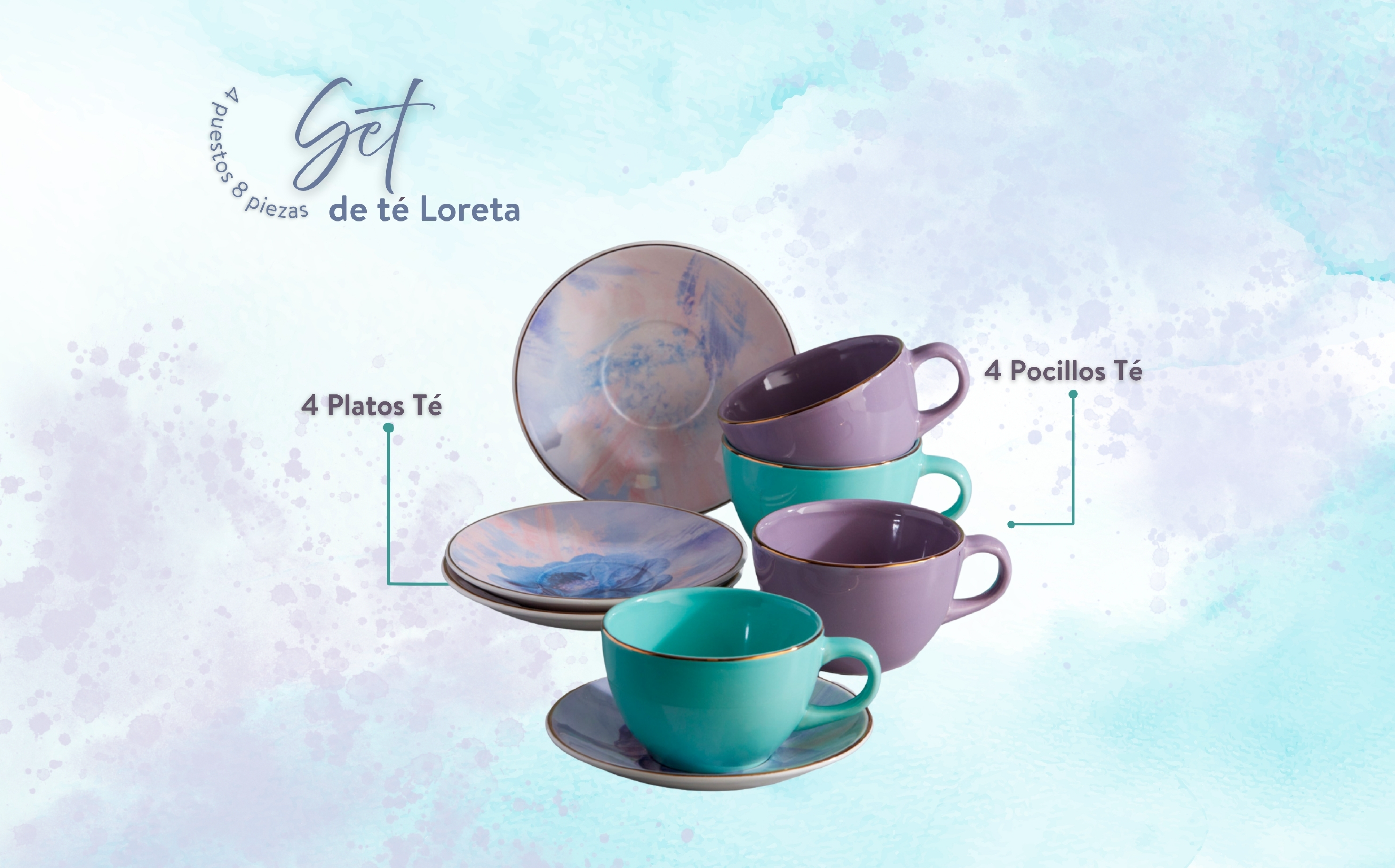 1 Plato Té 14.5cm Loreta Rosado 1 Plato Té 14.5cm Loreta Brush 1 Plato Té 14.5cm Loreta Azul 2 Pocillo Té 249.6ml Lavanda 2 Pocillo Té 249.6ml Menta. |