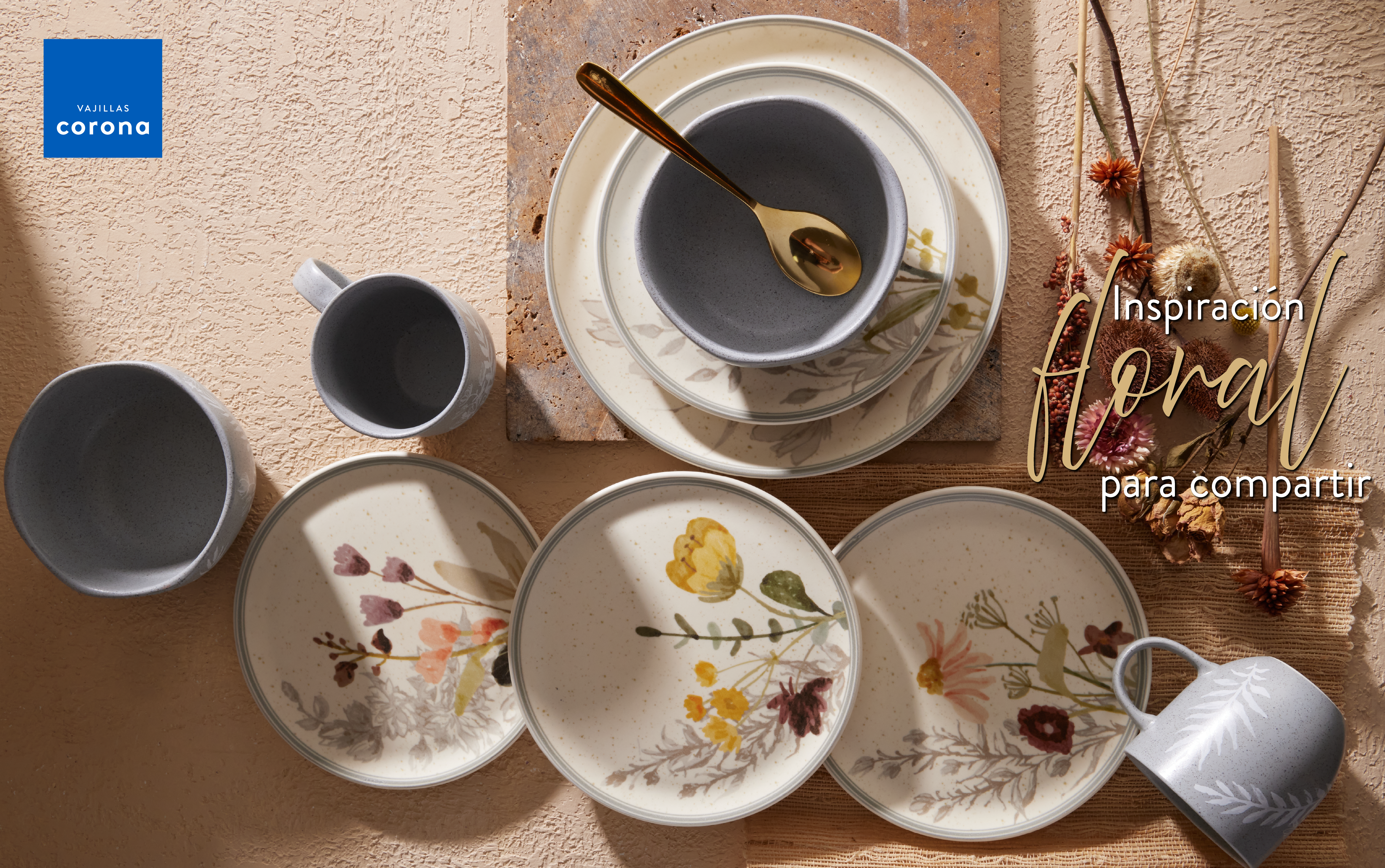 Inspirada en las flores de campo, esta decoración quiere llevar a tu mesa lo mejor de éste con decoraciones que nos transportan a estos lugares mágicos, esta vajilla llenará tu mesa de alegría y armonía para compartir.