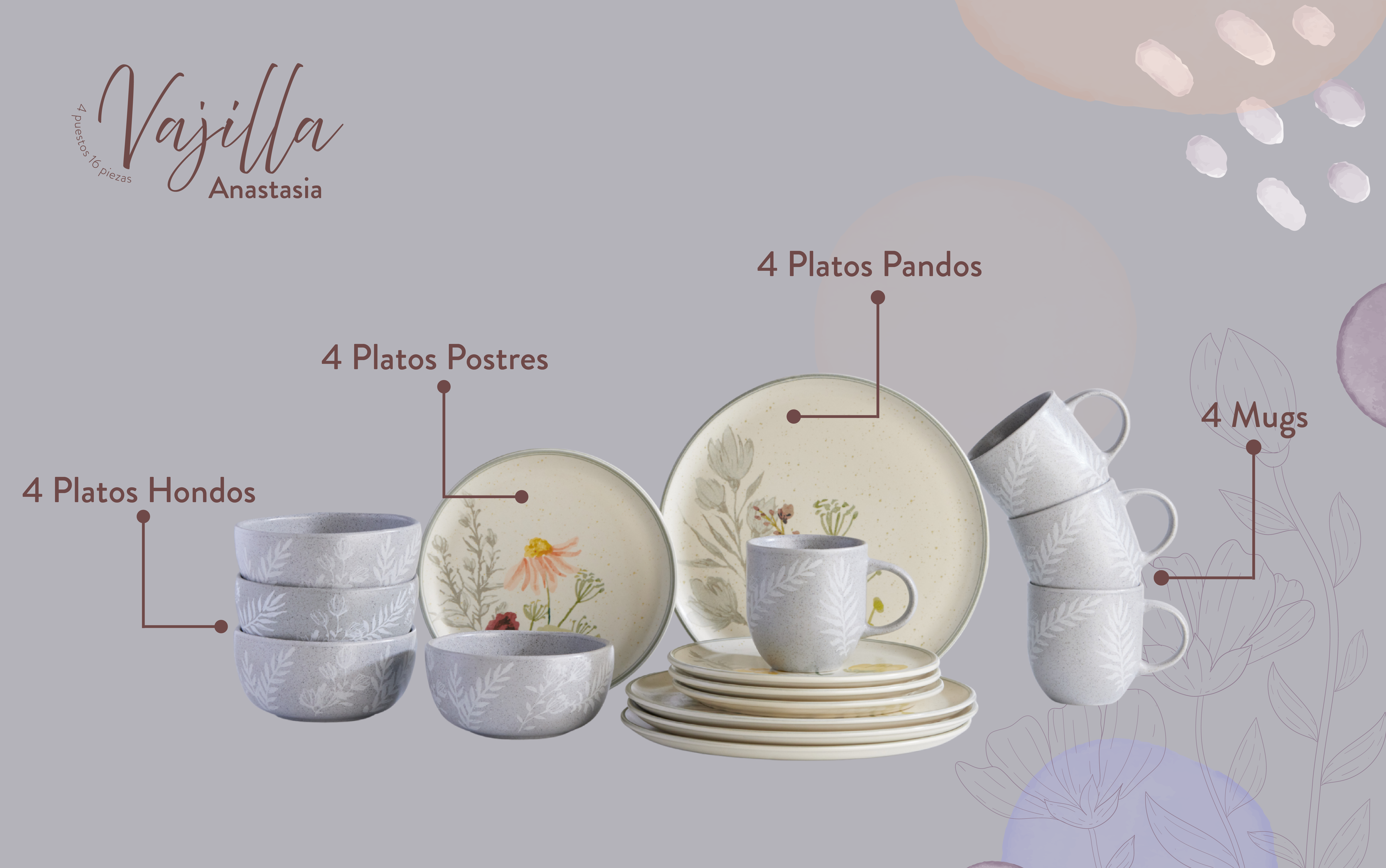 4 Mug 397.1ml Anastasia 4 Plato Pando 28.3cm Anastasia 1 Plato Postre 22cm Anastasia Rosado 1 Plato Postre 22cm Anastasia Amarillo 1 Plato Postre 22cm Anastasia Café 1 Plato Postre 22cm Anastasia Morado |