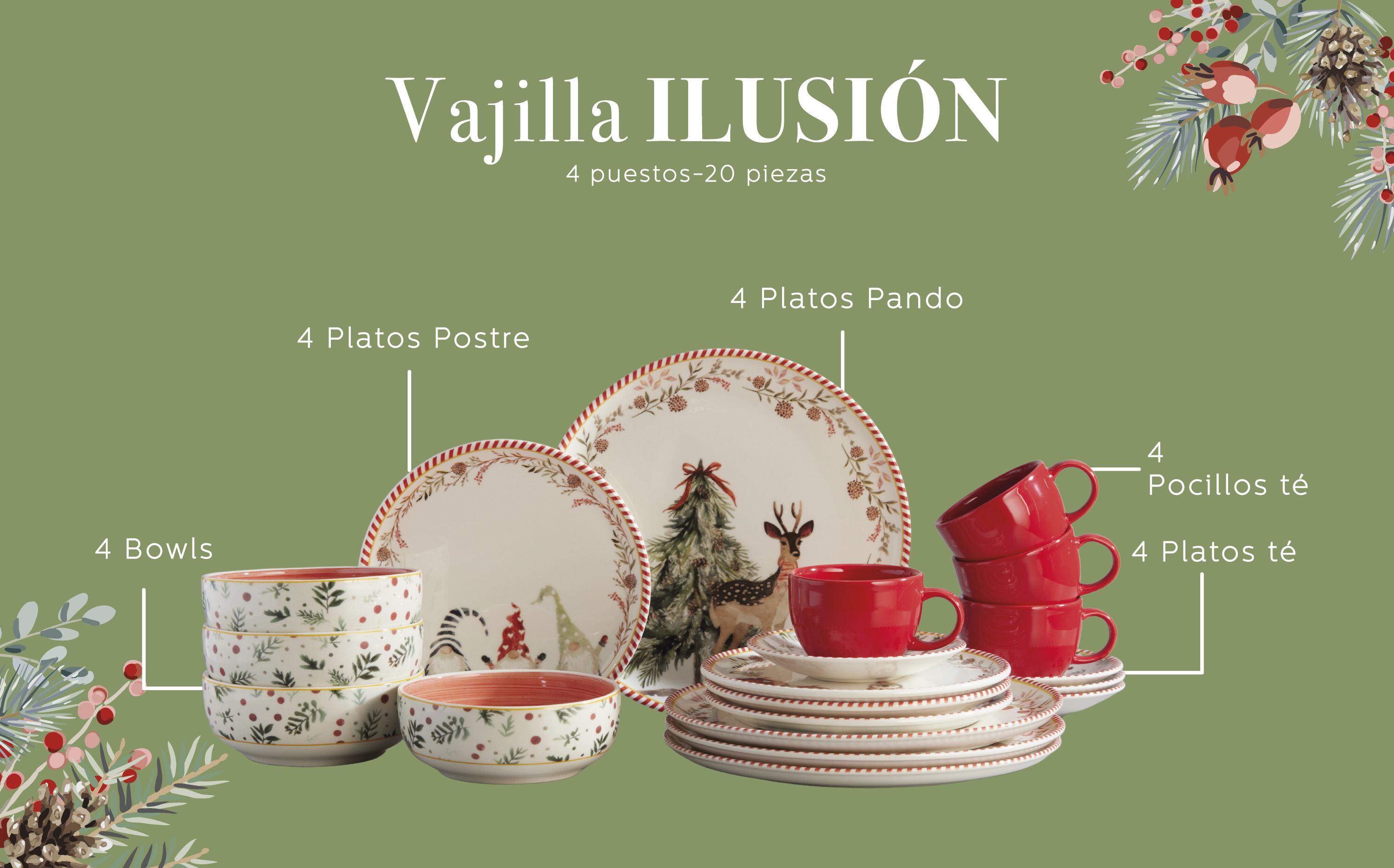 2 Plato Postre Ilusión Gnomos 21.4cm 4 Plato Pando Ilusión 27.6cm 4 Cerealero Ilusión Navidad 623.3ml 4 Plato Té Ilusión 15cm 4 Pocillo Té Color Rojo 229.5ml |