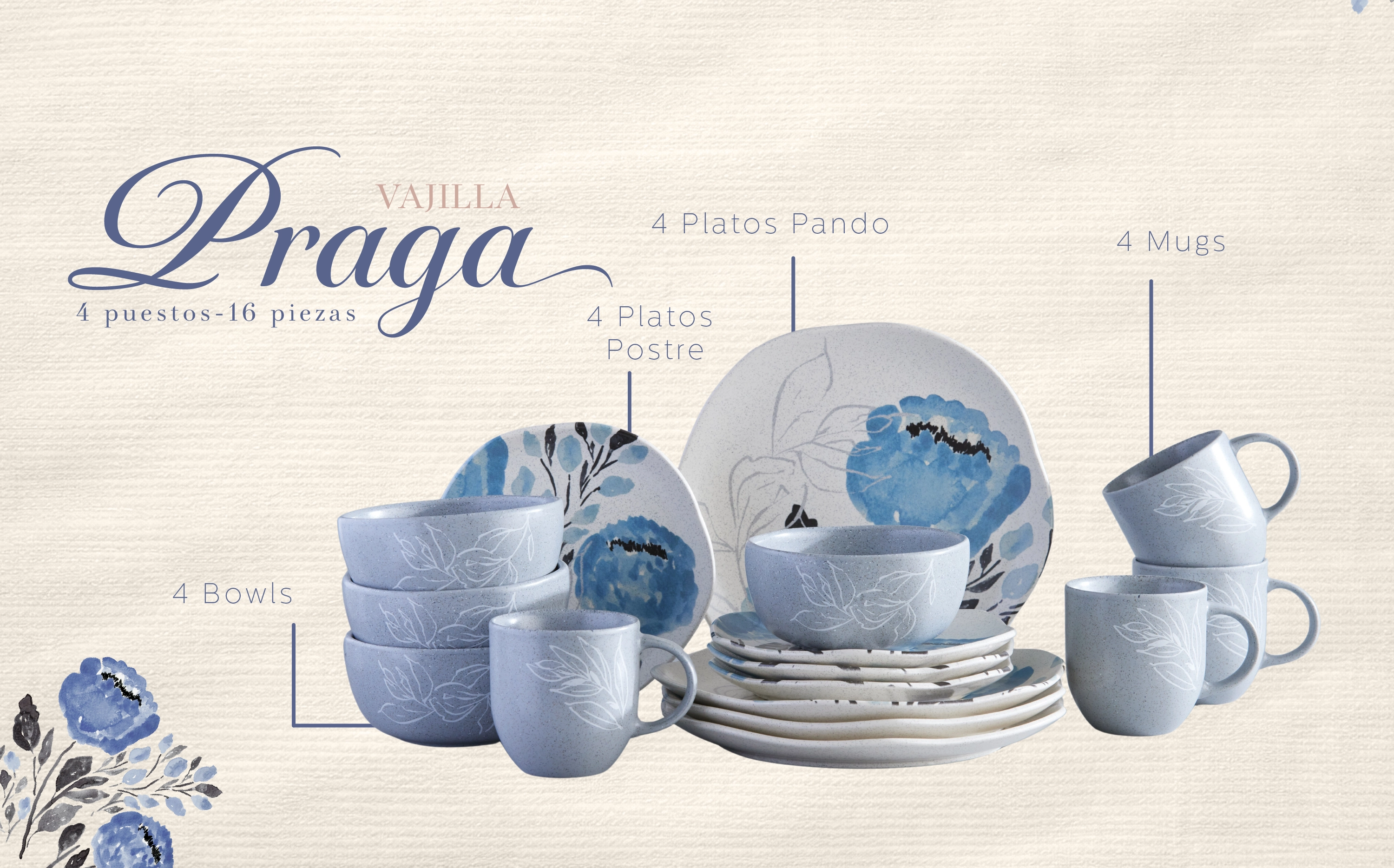 La vajilla Praga celebra la belleza de lo imperfecto con formas irregulares y flores azules que evocan calma y naturalidad. Sus piezas en esmalte azul profundo aportan contraste y equilibrio, haciendo de cada mesa un encuentro entre arte, naturaleza y elegancia atemporal.