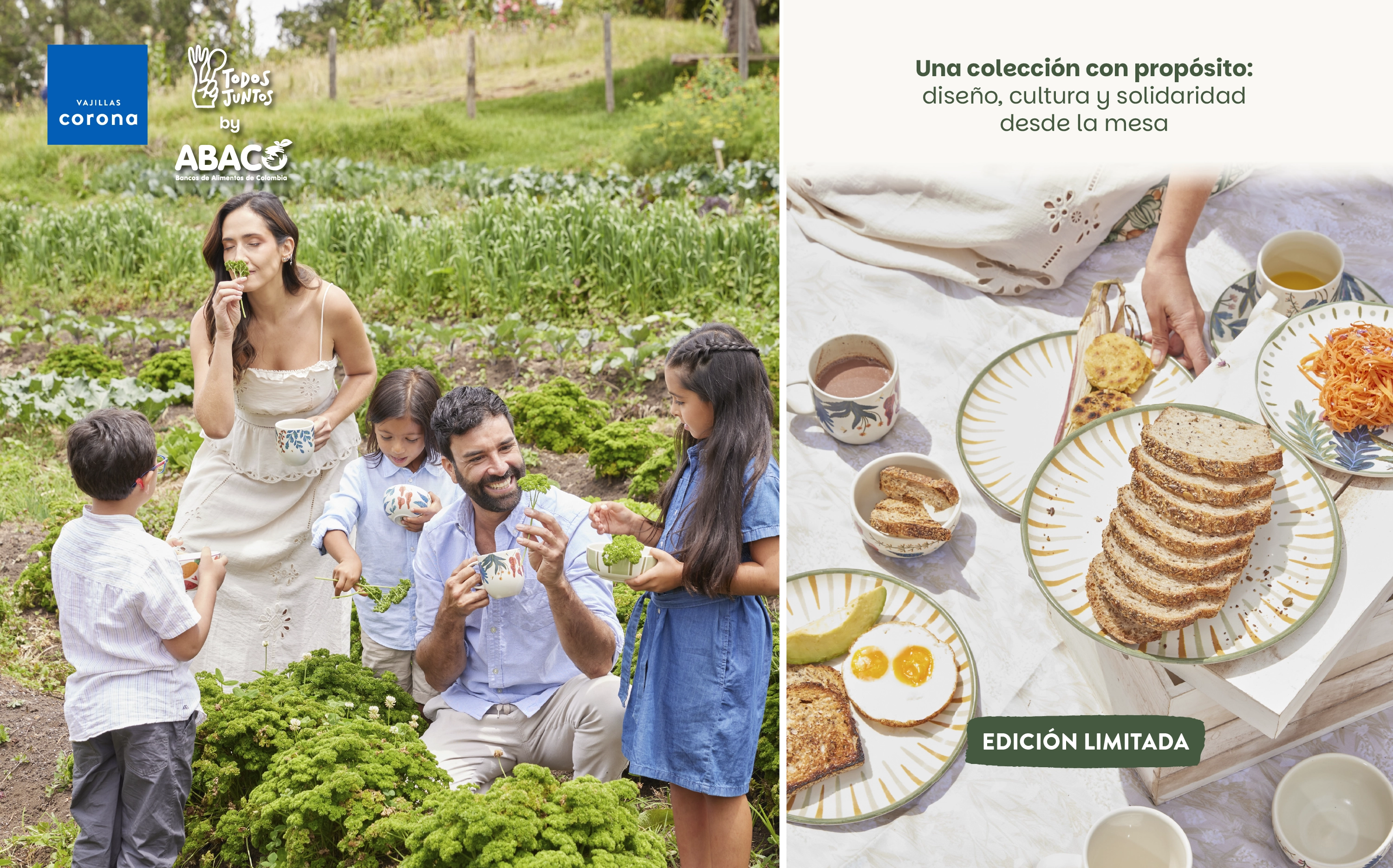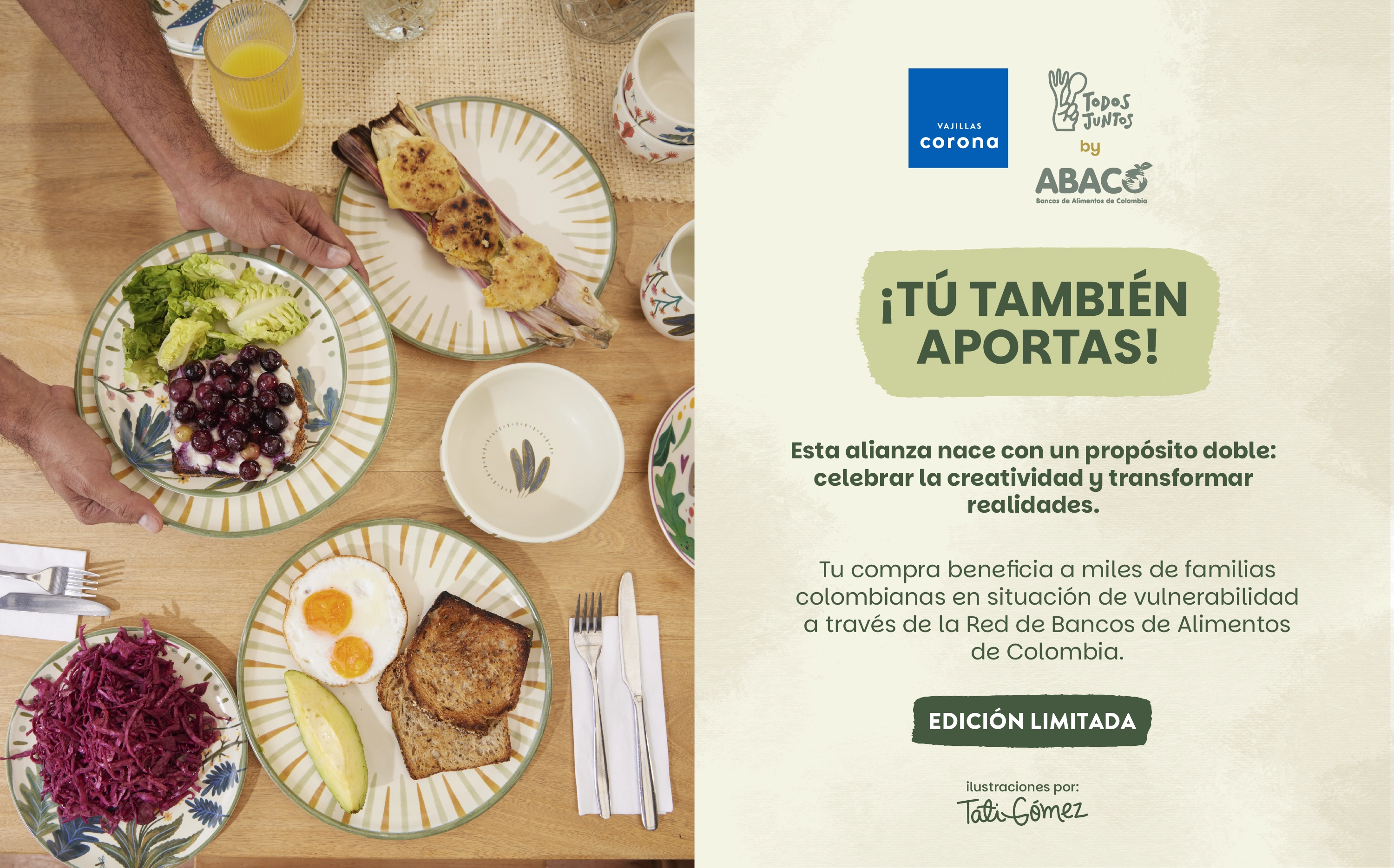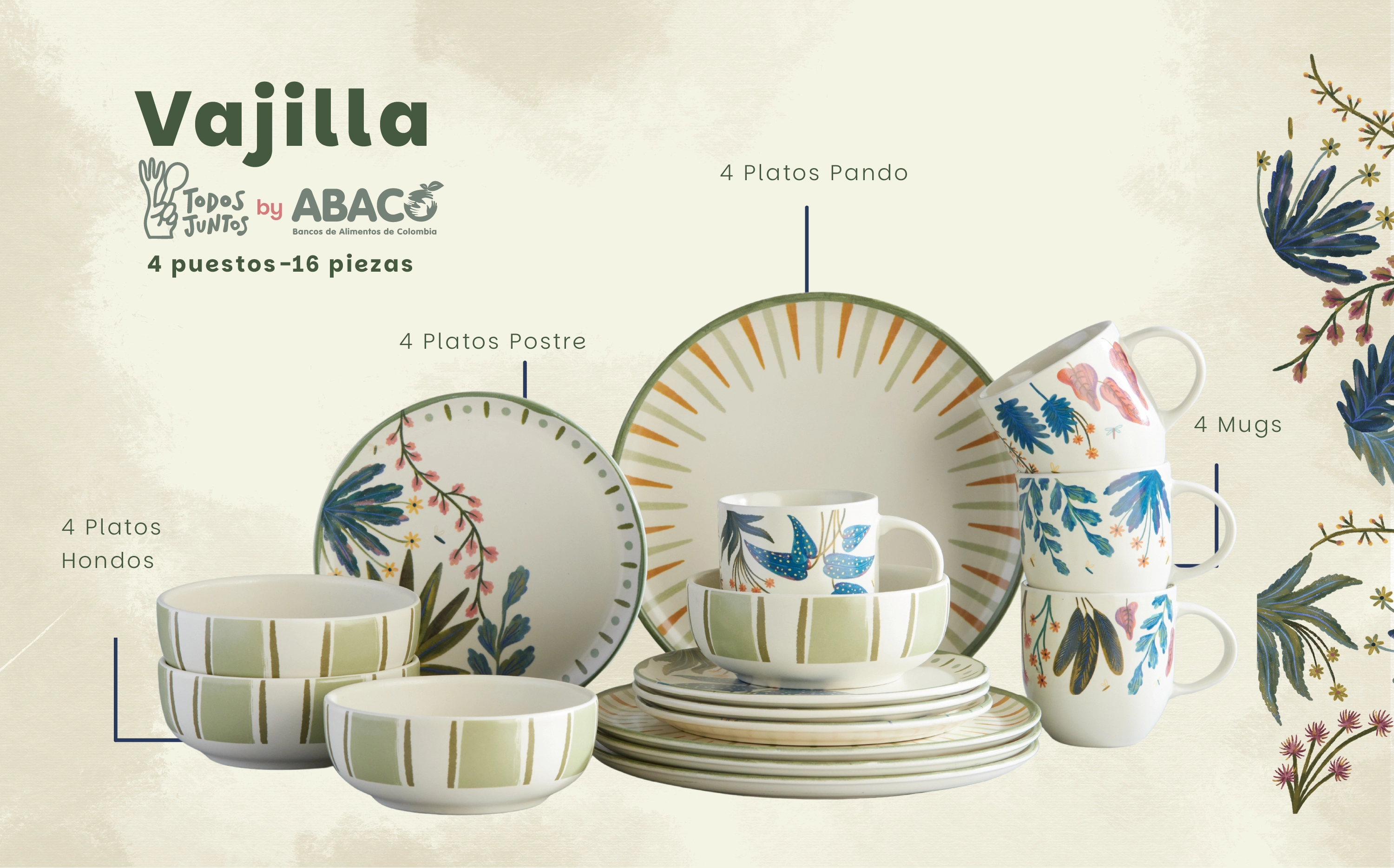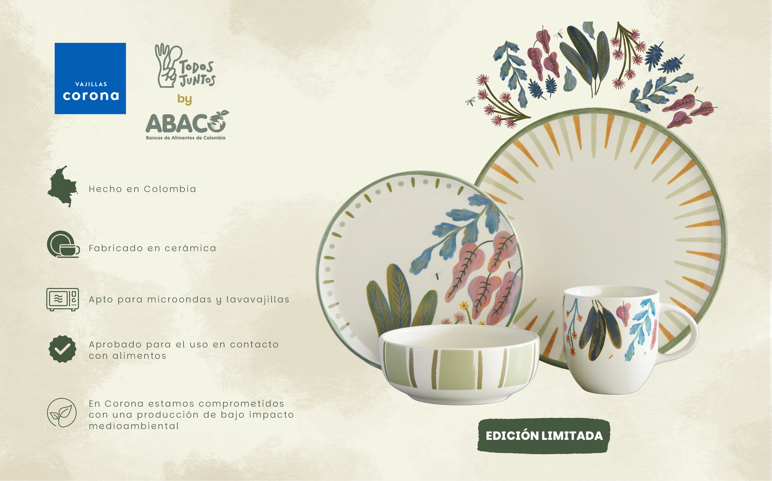 Una colaboración con propósito: donde el arte, la naturaleza y la solidaridad se encuentran. La vajilla Todos Juntos es una creación de Vajillas Corona en alianza con la Asociación de Bancos de Alimentos de Colombia – ABACO, una unión que celebra la solidaridad y el propósito compartido de alimentar esperanza. Esta vajilla de 4 puestos y 16 piezas, inspirada en la riqueza natural de nuestro país, combina ilustraciones de plantas colombianas con un diseño cálido y contemporáneo que invita a disfrutar, agradecer y conectar. Sus trazos orgánicos evocan vida, unión y esperanza, haciendo de cada encuentro una oportunidad para sembrar bienestar.