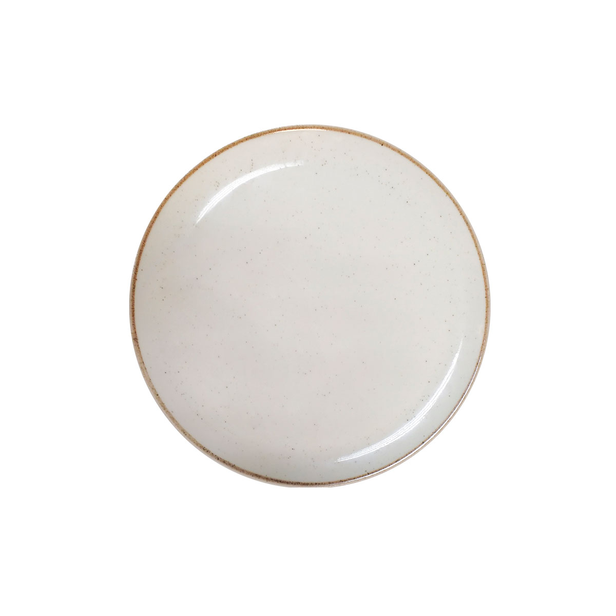 El Plato Postre Caoba en tono beige transmite serenidad y sofisticación. Su diseño contemporáneo con inspiración artesanal y borde marrón lo convierte en una pieza clave para complementar tu mesa con un toque de contraste elegante.
