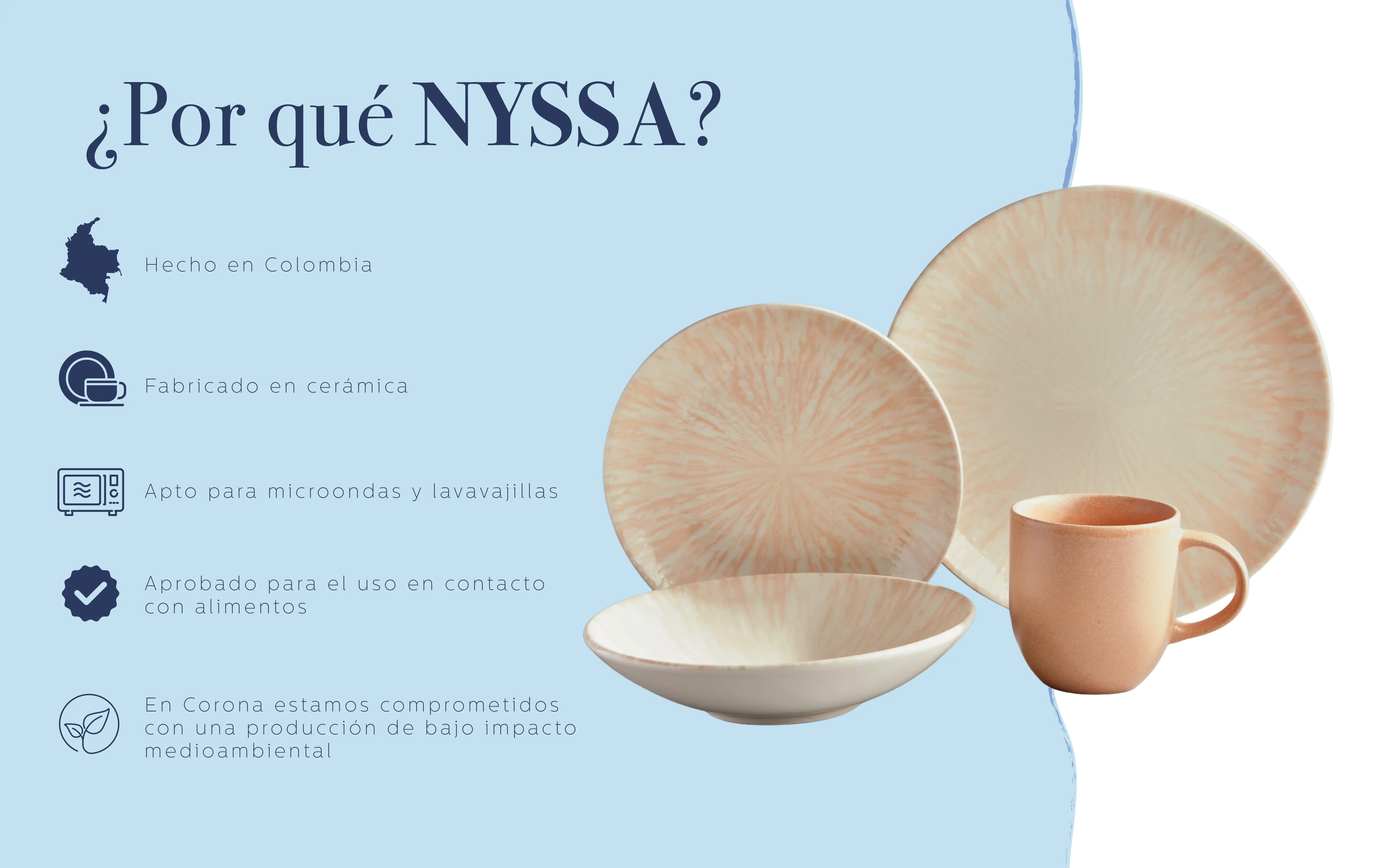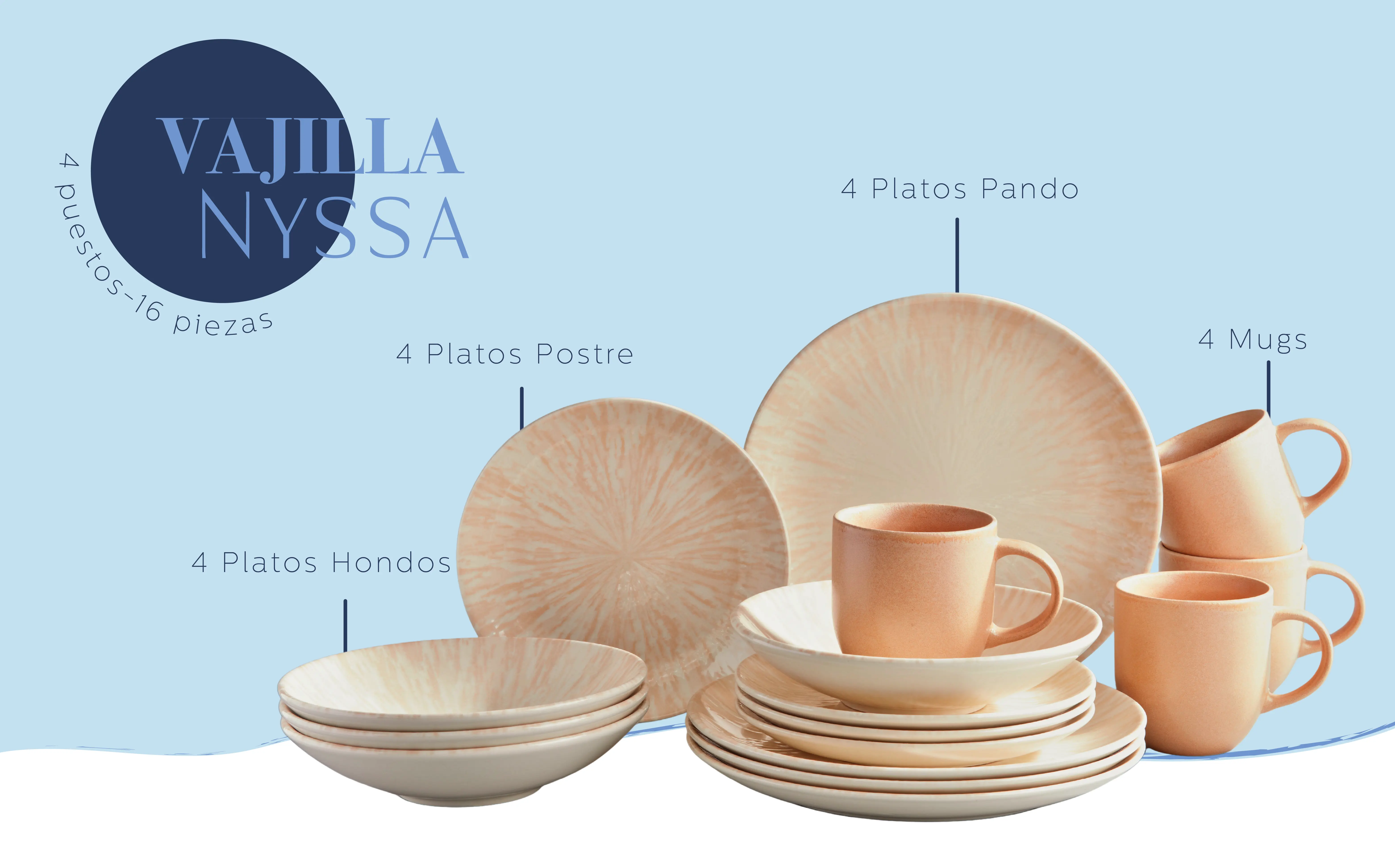 Inspirada en la calidez del sol y la serenidad de la arena, la Vajilla Nyssa combina texturas sutiles con un diseño armonioso que evoca la tranquilidad de la costa. Sus detalles en relieve capturan la esencia de los rayos del sol reflejándose sobre la arena, mientras que sus tonos neutros y elegantes la convierten en una pieza versátil que se adapta a cualquier mesa.